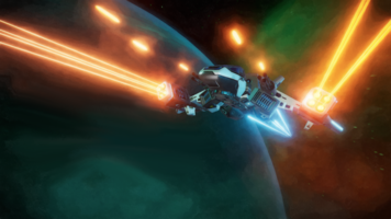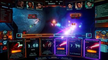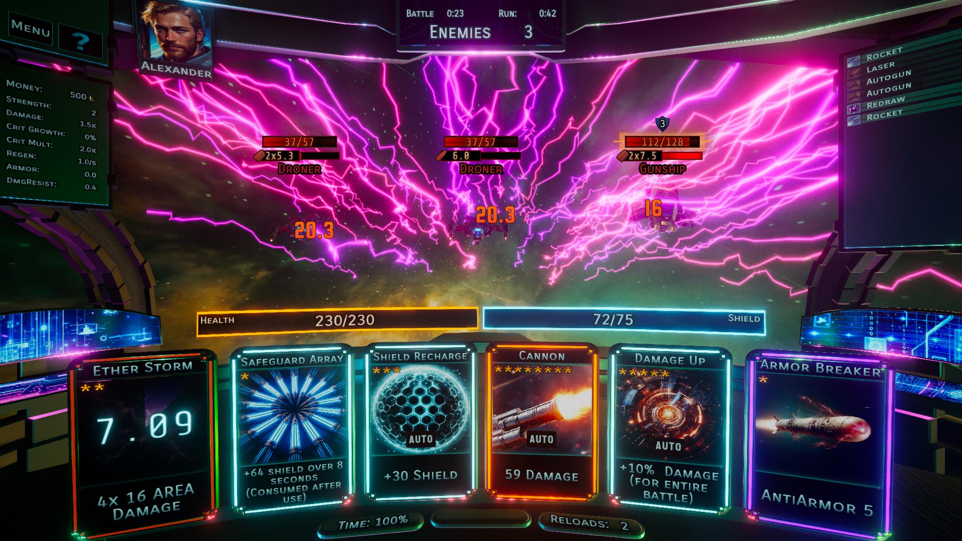 The space battles take place in real-time. The cards of your deck are weapons like lasers and rockets as well as other advanced battle systems. Playing a card uses up one ammunition of that specific card. After being played, a card is not automatically discarded, but it needs to cool down a couple of seconds before it can be used again. When all ammo has been used up, the card must be manually discarded to allow a new card to be drawn. There are no time constraints for deck optimization after each battle and for shop visits.Features:
