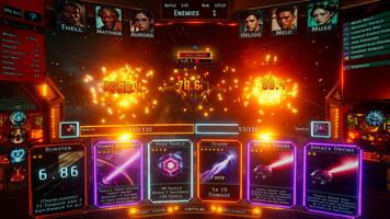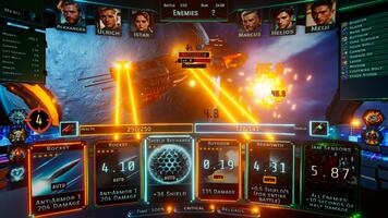 The space battles take place in real-time. The cards of your deck are weapons like lasers and rockets as well as other advanced battle systems. Playing a card uses up one ammunition of that specific card. After being played, a card is not automatically discarded, but it needs to cool down a couple of seconds before it can be used again. When all ammo has been used up, the card must be manually discarded to allow a new card to be drawn. There are no time constraints for deck optimization after each battle and for shop visits.Features: